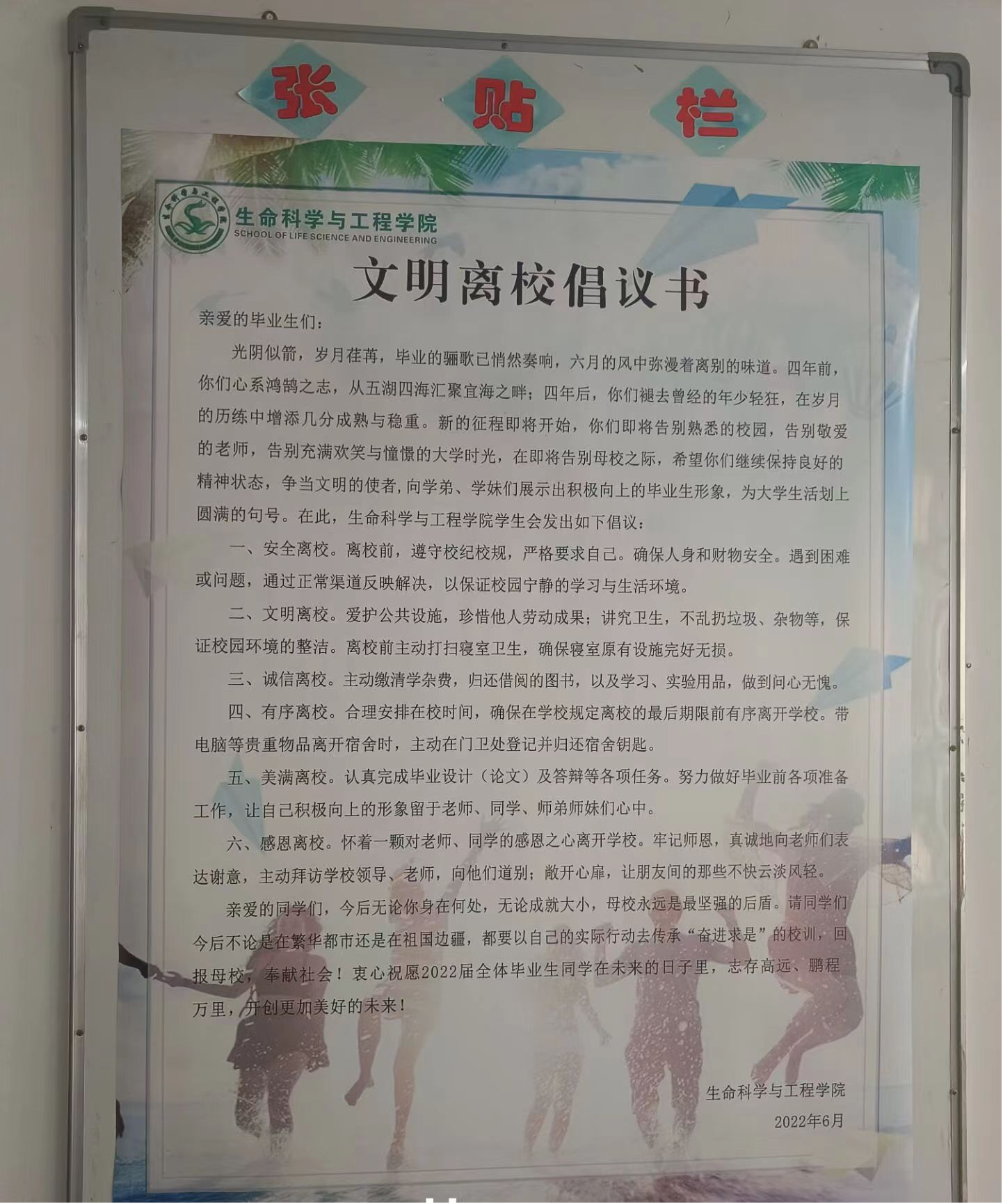 “倡文明离校,寄母校情怀”——毕业生文明离校倡议书。毕业季,既有对母校的依恋与不舍,也有对未来的美好憧憬。为了使毕业生们充分感受氛围,为自己的老员工涯画上圆满的句号,为母校留下文明、留下形象。k8凯发为动员全体毕业生文明离校,发起了“文明离校倡议书”活动。公司在员工公寓张贴了致毕业生文明离校的倡议书。