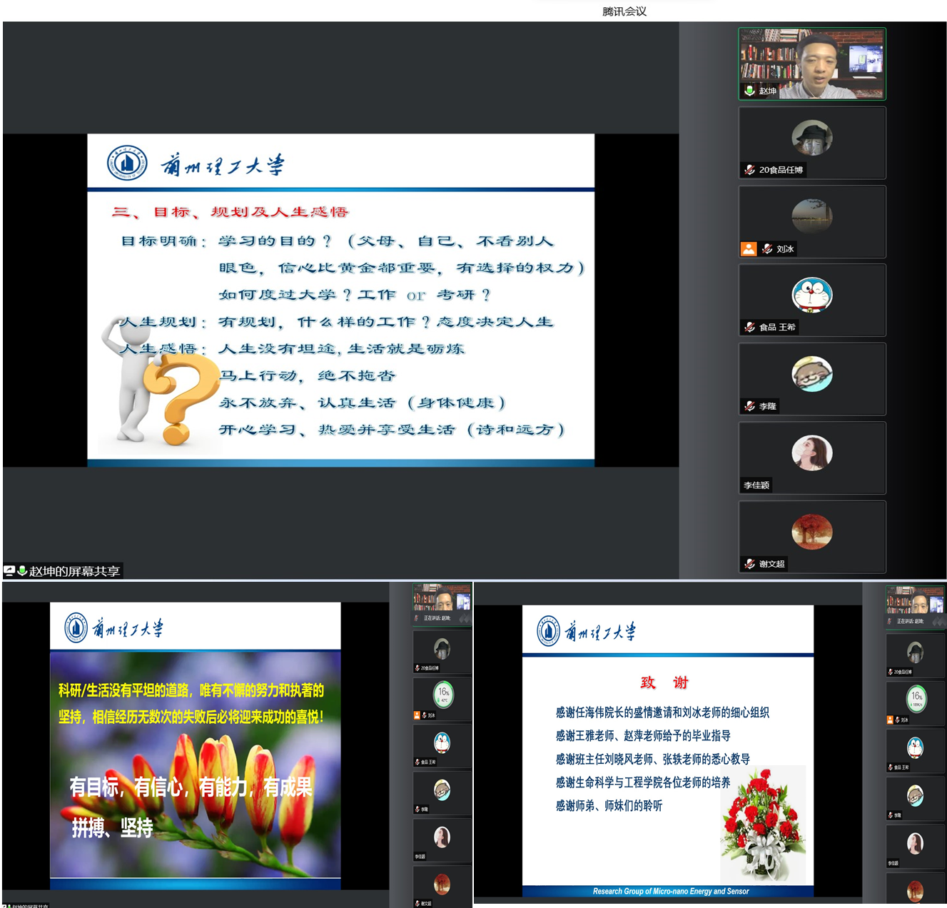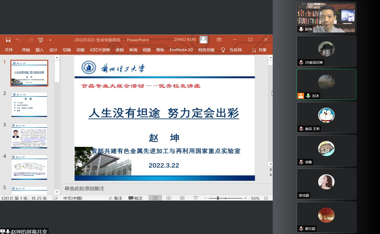 疫情防控期间,为激励广大青年学子坚定理想信念、珍惜大学时光,自强不息、奋发拼搏,3月22日晚8:00,k8凯发食品科学与工程专业19级、20级和21级同学们通过腾讯视频会议开展“大班会”活动。本次活动邀请食品专业优秀员工、公司省部共建有色金属先进加工与再利用国家重点实验室赵坤博士,为同学们带来“人生没有坦途 努力定会出彩”主题讲座。k8凯发副经理任海伟、19级班主任范文广和20级班主任刘冰参加活动。