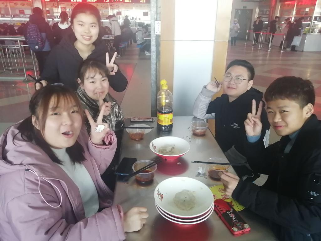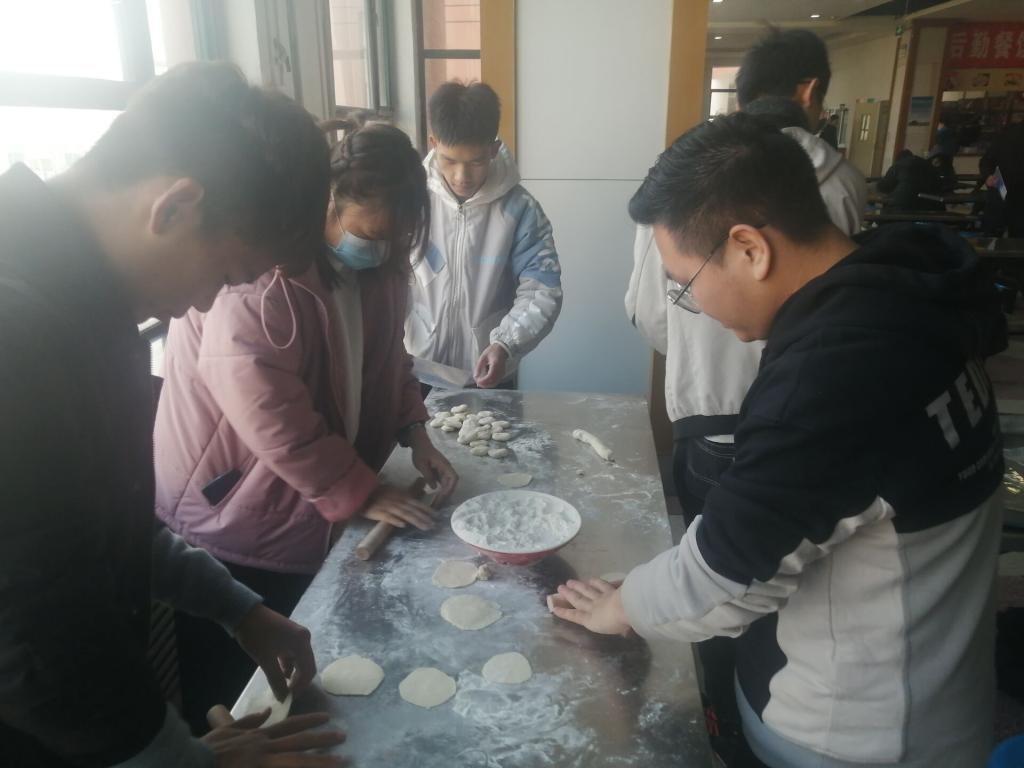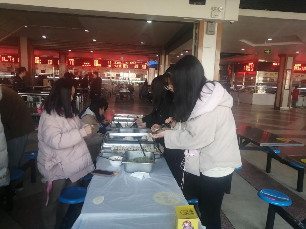 在简单的布置会场后,食堂工作人员为我们调好了饺子馅和面团,在场的同学们以班级为小组开始忙碌,分工后大家迫不及待地挽起了衣袖准备大干起来,窗外寒意袭人,食堂内却是热闹非凡、欢声笑语。老师也捋起袖子加入到包饺子的阵营中,师生协作,其乐融融。