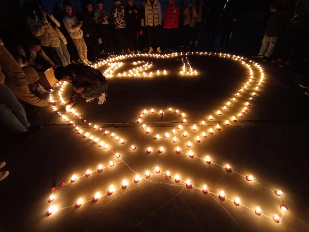 夜幕降临,参与“关艾生命”主题活动的全体成员聚集在红柳广场,共同点燃蜡烛为“艾”祈福,此次活动在一片温馨的气氛中落下帷幕。