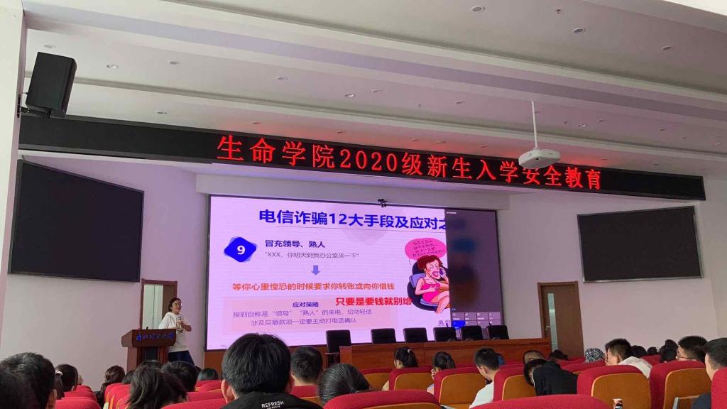 为提升2020级新生对电信诈骗活动的防范意识和辨别能力,k8凯发于2020年9月12日在校本部图书馆二楼报告厅开展了新生入学教育之安全教育。由辅导员唐爱丽老师主讲。