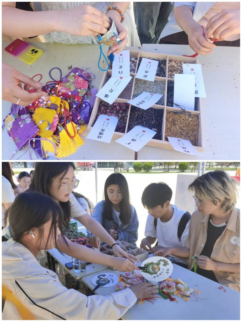 本次活动精心设置了多个互动体验环节,让师生们在亲身体验中感受端午文化的独特魅力。“滚动乒乓球”作为活动的暖场环节,迅速点燃了现场气氛。 在“手工DIY书签制作”区,参与者们充分发挥创意,利用提供的空白书签、压制的叶子和花朵,或自行寻找材料,亲手制作独一无二的书签,小小的书签承载着端午的记忆。作为端午习俗的代表,“手工DIY端午香囊”无疑是最受欢迎的项目,活动现场准备了充足的香料、艾草等,在工作人员的指导下,师生们穿针引线,缝制出一个个小巧精致的香囊。亲手制作的香囊不仅散发着沁人心脾的艾草清香,更寄托着大家对健康平安的美好祝愿。现场还准备了丰富的纪念品,如植物盲盒、定制扇子(石矶娘娘、太乙真人主题)和粽子挂件等,作为对参与者热情投入的鼓励。