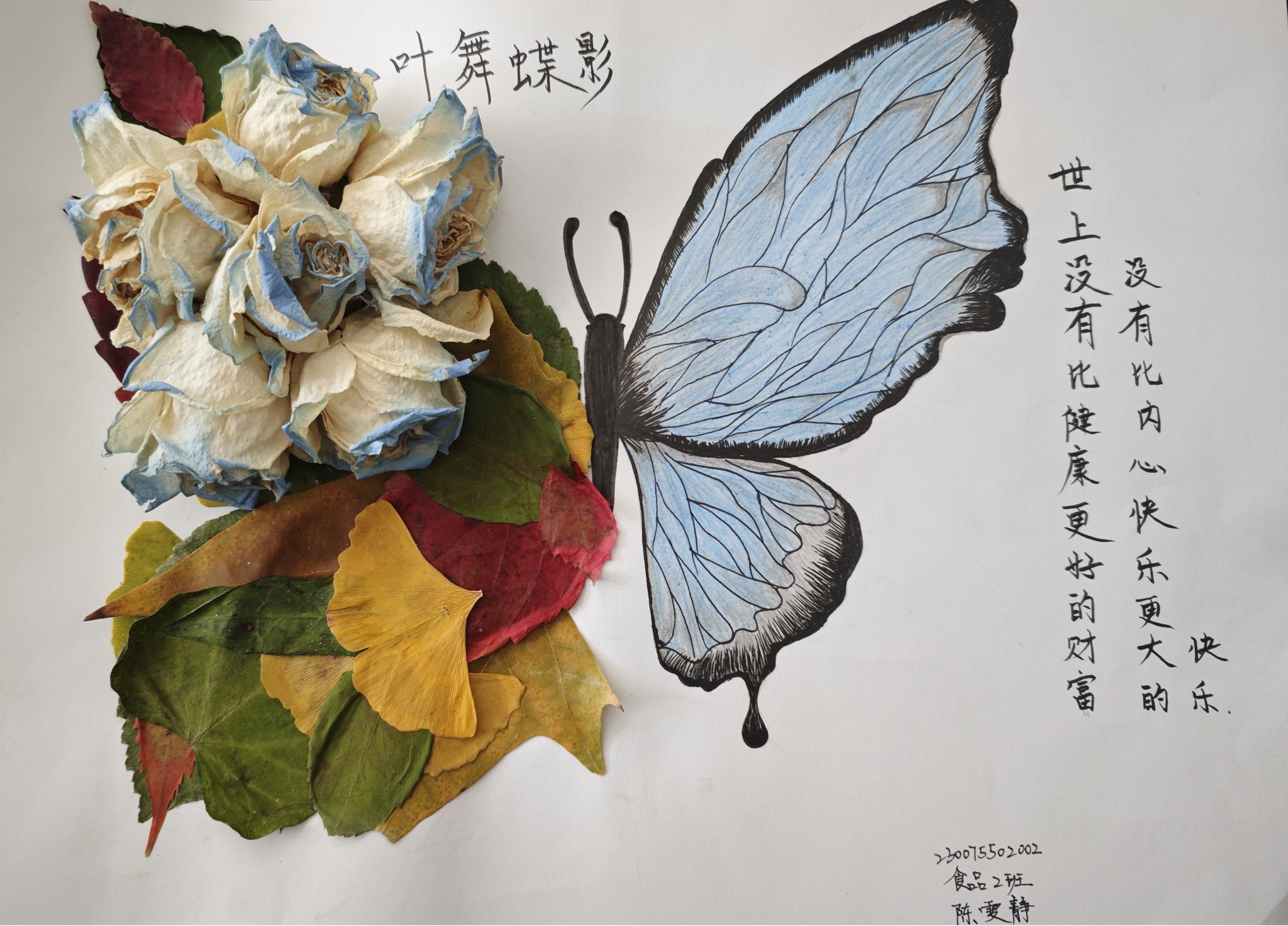 活动鼓励同学们发挥创意,制作包含健康元素的作品。同学们积极响应,用收集来的落叶精心创作,每一片叶子都经过巧妙构思,或拼接、或绘制,展现出独特的艺术视角。这些作品不仅是对秋天的赞美,更巧妙地融入了健康元素,如象征健康生活的运动图案、代表健康饮食的蔬菜水果样式等,将自然之美与健康理念完美结合。最后作品“叶舞蝶影”获一等奖;作品“茸客、“慎食枫叶”、“秋叶绮梦”获二等奖;作品“叶绘果趣”、“金色丰收”、“合理膳食”获三等奖。
