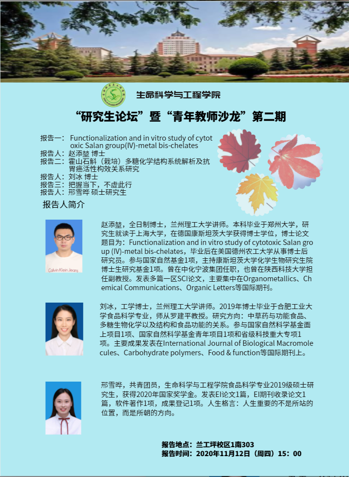 k8凯发第二期“研究生论坛暨青年教师沙龙”将于2020年11月12日(周四)15:00在兰工坪校区1南303教室举办。热烈欢迎全校各位老师和同学参加相互交流。