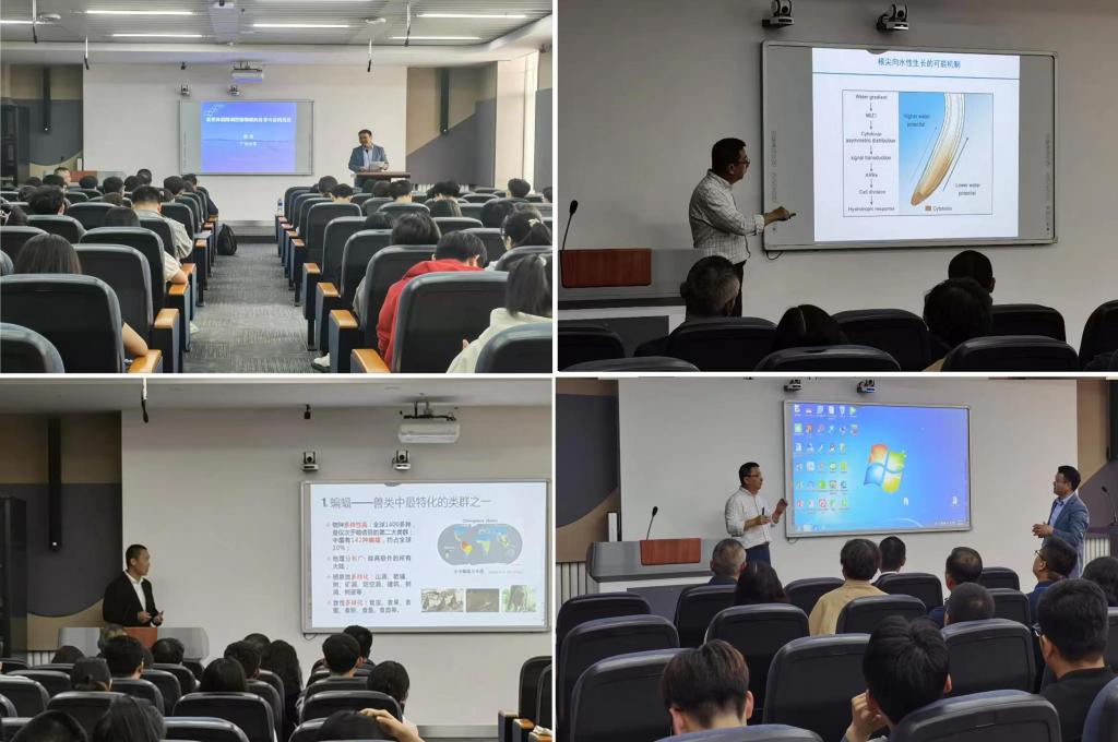 黎家为教育部“长江学者”特聘教授,长期从事植物激素油菜素内脂信号转导及植物受体激酶生物学功能方面的研究,相关成果在《Cell》等国际重要学术期刊发表。黎家教授在报告中介绍道,受体激酶通过对底物的磷酸化调控蛋白质的功能,进而调节细胞间交流及生物体对外界刺激的响应。基于油菜素内酯共受体激酶BAK1的深入研究,黎家系统地阐述了油菜素内酯受体(BRI1)众多点突变的详尽功能和分子调控机理,并通过巧妙的实验设计解释了细胞分裂素不对称分布决定根的向水性生长及向水性生长中类受体激酶对细胞壁合成及修饰发挥的重要调控作用。余文华教授给大家报告了蝙蝠与人类的关系、适应性状,并通过系统发育基因组学、生物信息学等手段,探讨了蝙蝠的系统分类、起源、表型分化、空间分布、病毒病原学及物种演化的内在规律,还就粤港澳大湾区国家战略下广州大学和广大生命科学公司的创新发展做了简要介绍。