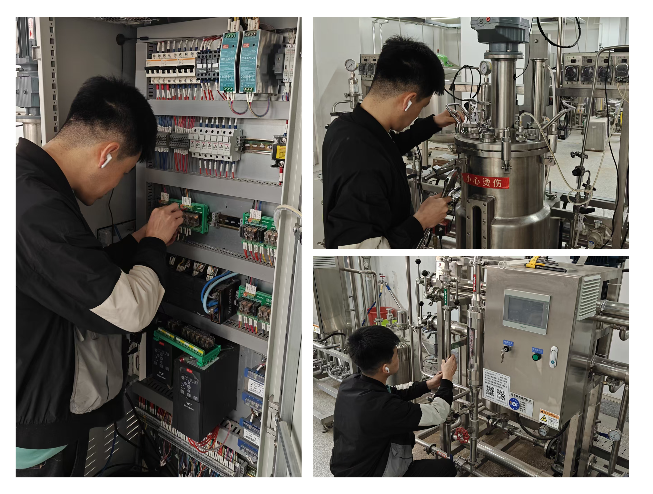 本次检修工作与此前完成的实验室优化布局相衔接。本次重点针对发酵设备、分离纯化系统、温控装置及电气线路等关键设备开展检修、维保。工程师团队对设备的运行状态、温控精度、压力容器安全性及电路稳定性进行了全面检测。例如:校准了发酵罐及温控系统的温度传感器与加热元件,确保培养环境稳定,避免因温控偏差影响实验结果;及时更换了分离纯化系统的老旧零部件,并排查了电气系统电源线路老化、接口松动等问题,消除了用电安全隐患。