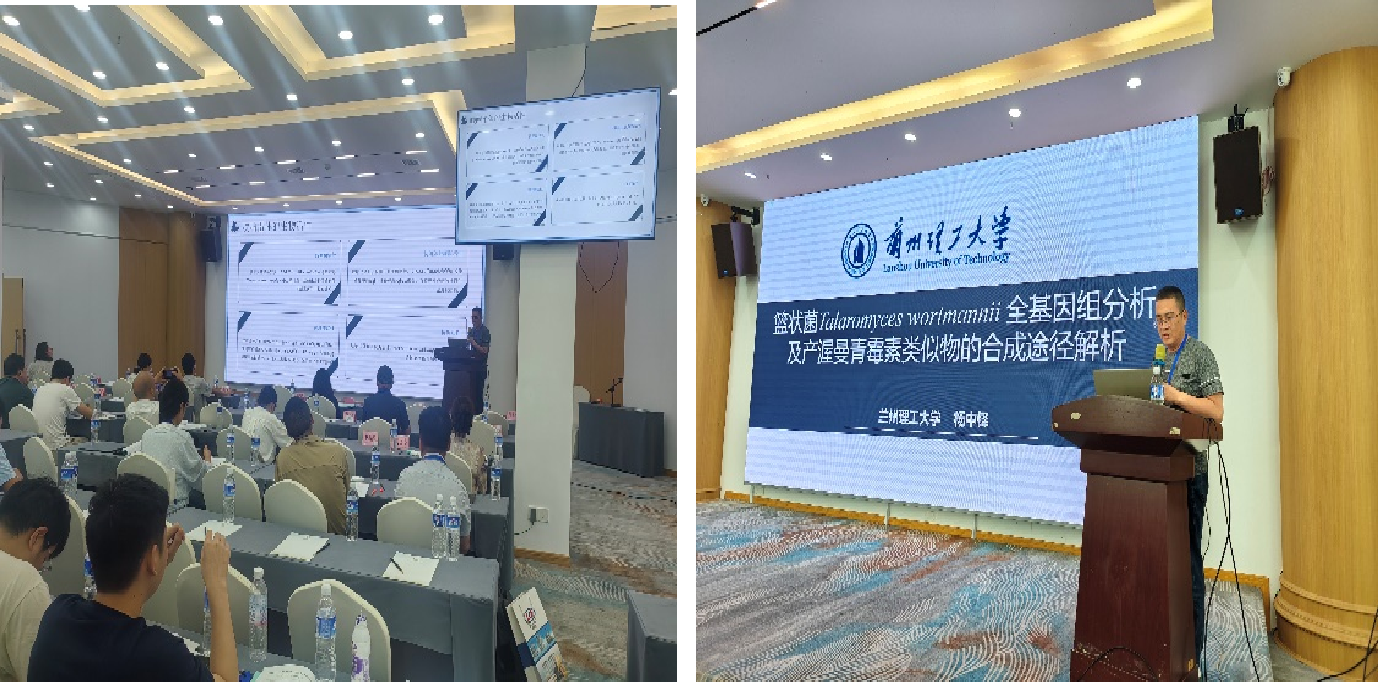 在大会报告环节,杨中铎教授以“篮状菌Talaromyces wortmannii 全基因组分析及产渥曼青霉素类似物的合成途径解析”为题,分享了其研究团队的最新成果。报告系统阐述了通过对特殊篮状菌株进行全基因组测序与深度分析,结合生物信息学和代谢组学手段,解析其合成具有重要生物活性(如抗肿瘤、抗炎)的萜类天然产物——渥曼青霉素及其类似物的关键基因簇与代谢途径。该研究不仅揭示了该菌株的次级代谢潜力,也为后续利用合成生物学技术改造菌株、优化发酵工艺,实现这些高价值天然产物的高效生物制造奠定了坚实的理论基础,体现了基因组学在挖掘微生物资源和指导合成生物学应用中的核心作用。杨教授的报告内容详实、见解深刻,引起了与会专家学者的广泛关注和热烈讨论。