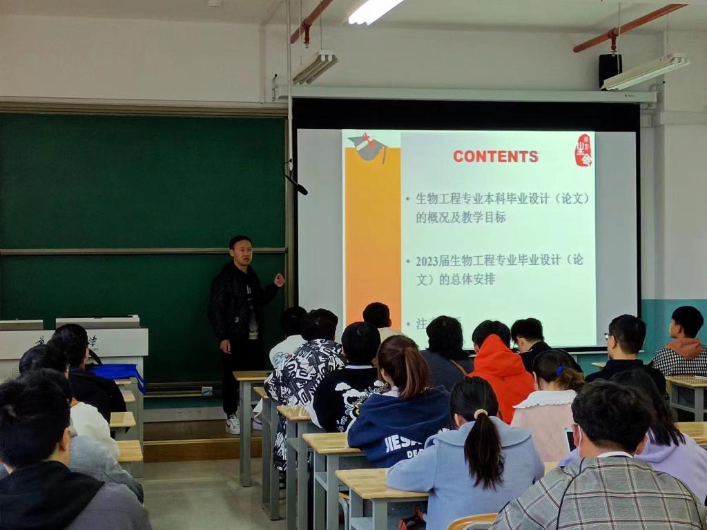 为进一步规范管理,加强对本科毕业设计(论文)环节教学工作的质量控制,切实提高生物工程专业的毕业设计(论文)质量和教学实效,提升专业及学科的影响力,生物工程系于2023年3月6日上午,在彭家坪校区舒卷楼211教室召开了2023届生物工程专业毕业设计(论文)动员会,大会由生物工程系副主任冷非凡副教授主持并主讲,生物工程系主任李善家教授、班主任程子义博士出席了本次动员会。