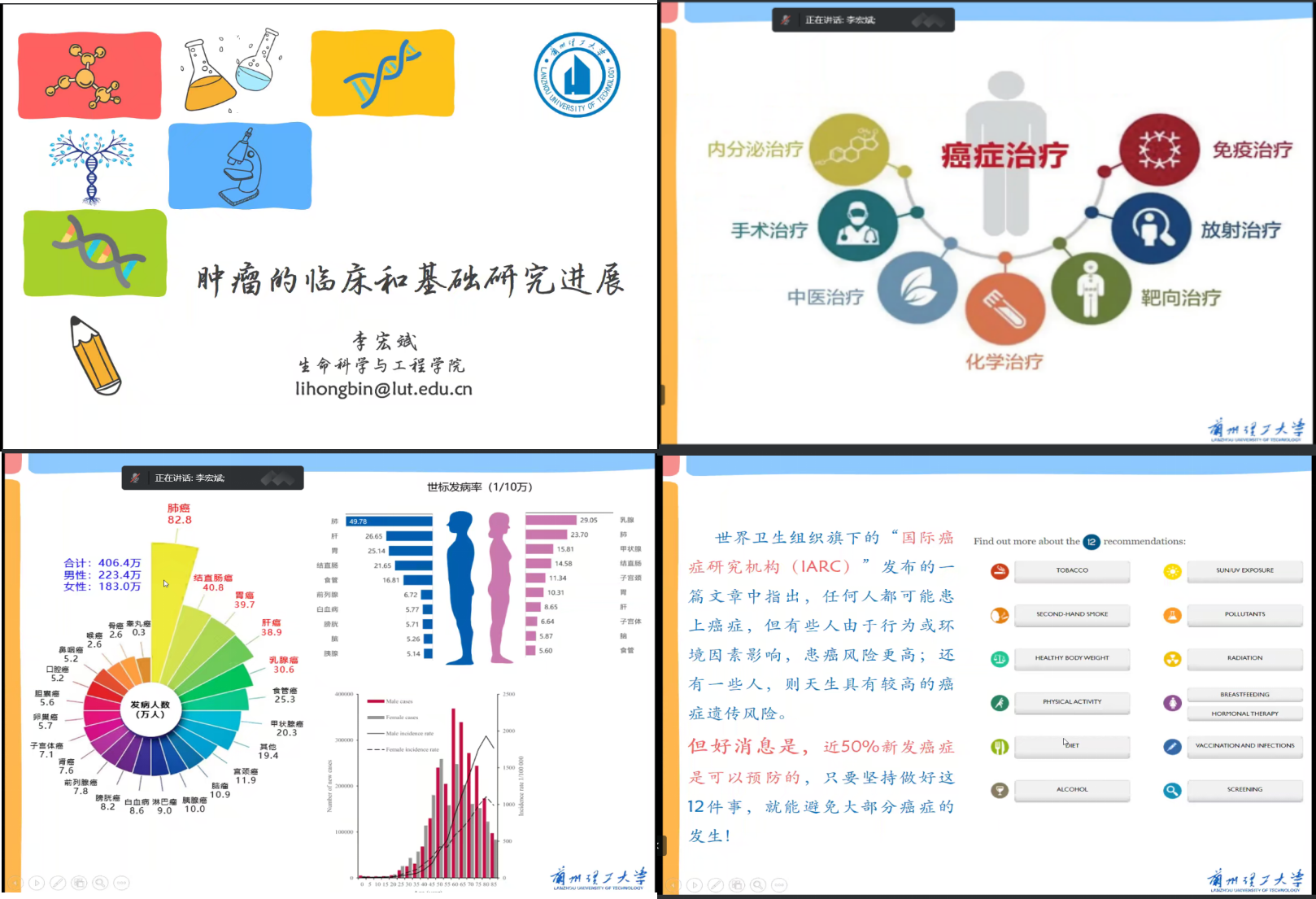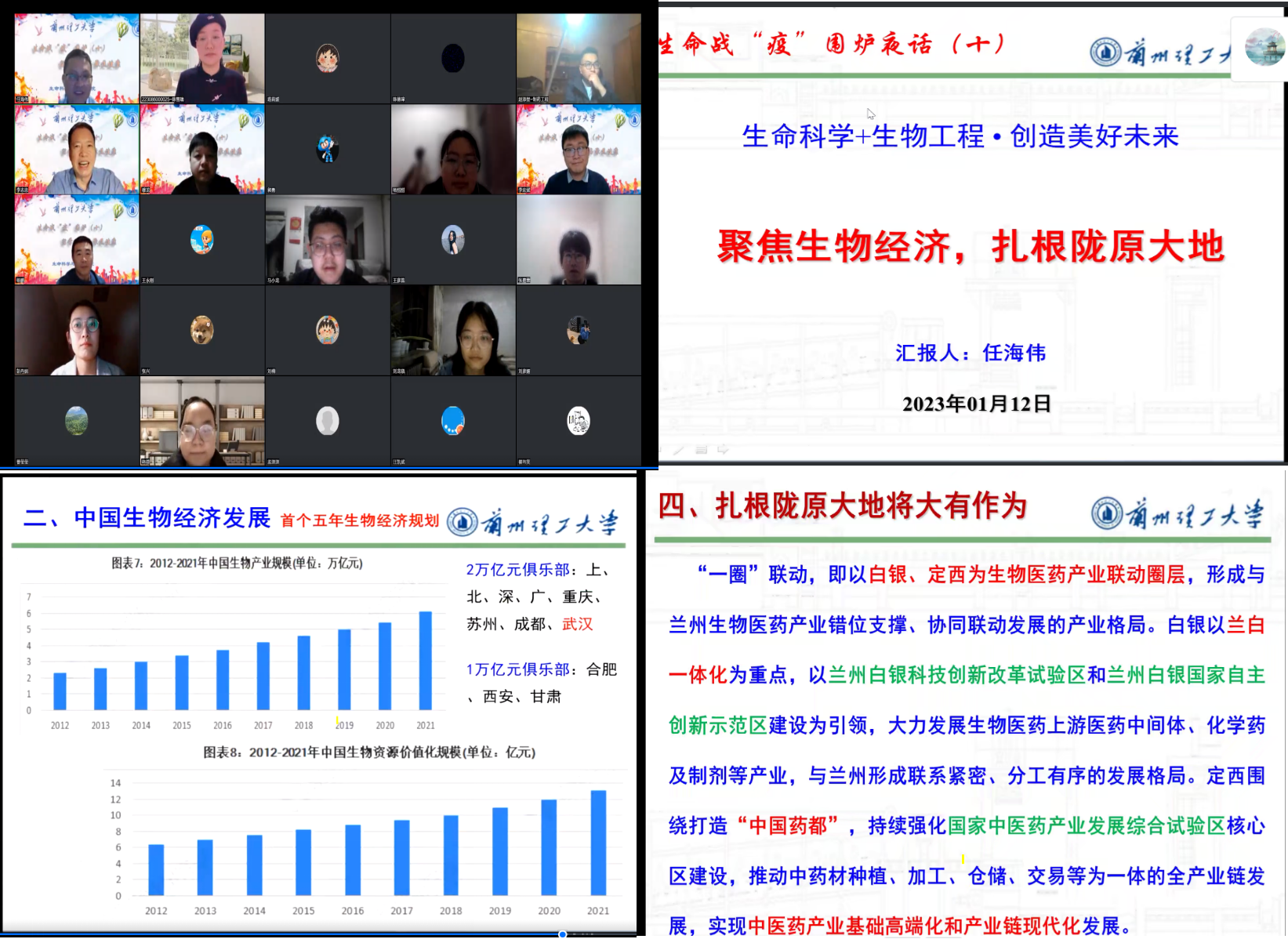 李宏斌在《肿瘤的临床和基础研究进展》中介绍了肿瘤临床研究进展和治疗方法,分享了在川大七年“筑基”、兰州生物制品所三年“养基”、中科院近物所博士“强基”,获得“李宏斌博士服”的奋斗经历。赵添堃在《我的职工涯》中回顾了经过郑州大学药学、上海大学有机化学七年“阵痛”获得“新生”,“行万里路”到德国康斯坦斯大学(博士)、美国德州农工大学(博士后)“读万卷书”,学成归来报效祖国。任海伟在《扎根陇原大地,聚焦生物经济》中阐述了世界和中国生物经济及其未来发展方向,鼓励生命学子要热爱专业,将自己奋斗融入国家需求和时代发展的潮流之中,勇担历史使命,为实现中华民族伟大复兴的中国梦贡献青春的力量。