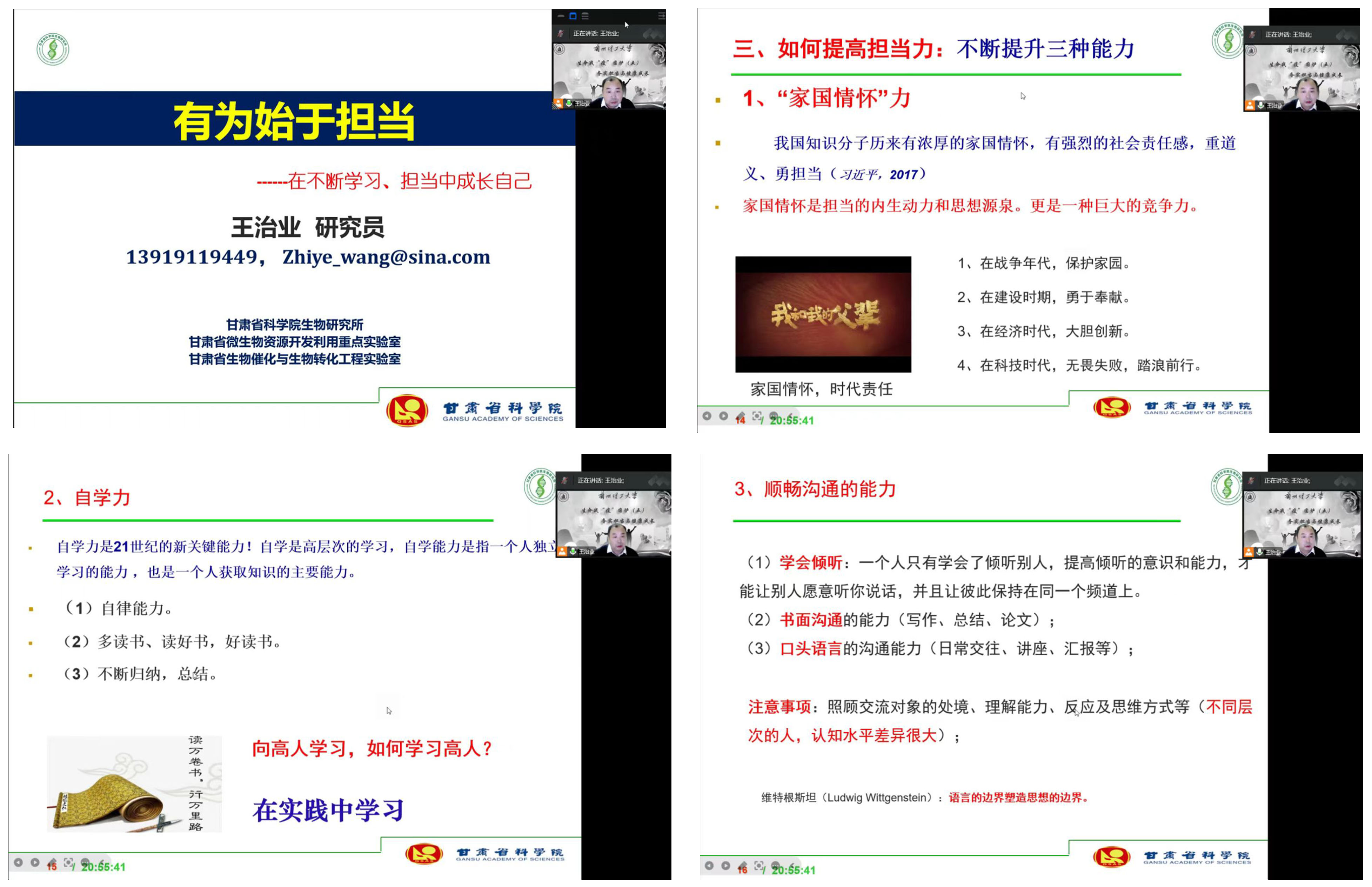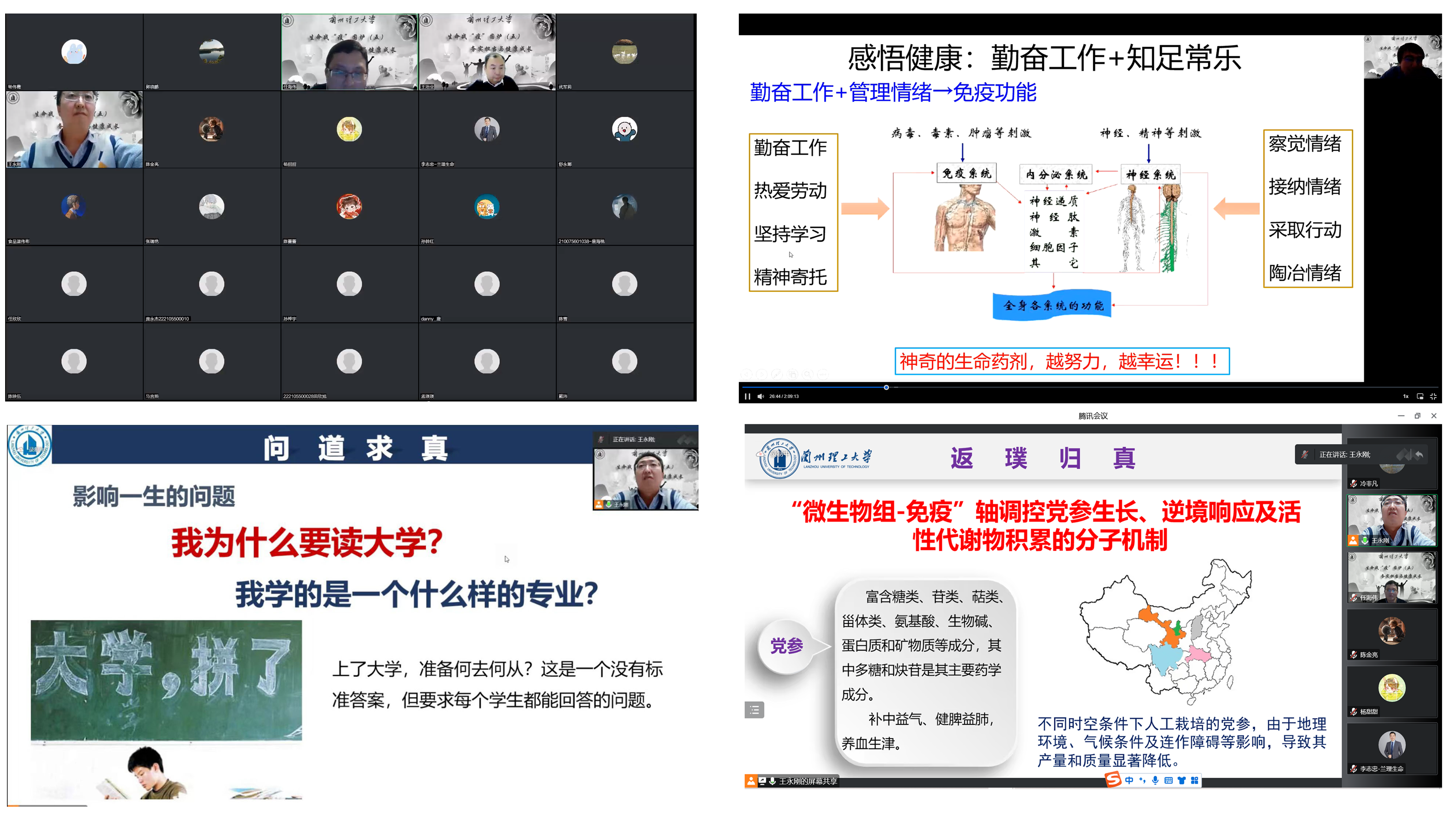 郭晓鹏在《探究科研 感悟健康》分享了“我们从事生命科学研究为人类大健康事业提供了理论和实践支持,需要在宏观和微观层面探究中提升专业自信;科学作息、重视健康对每个人的成长都非常重要”。王永刚在《求真 务实 成长》中讲述了从山西小山村“问道金城,求取真经”,本科毕业留校后“行远自弥,卓厉奋发”,继续攻读硕士、博士,回报母校培养和老师关怀;鼓励学弟学妹们“静心学习,寻梦而行”。王治业在《有为始于担当》中说,当年从轻纺工业公司毕业分配到张掖,通过“持续不断地学习、重于泰山地担当”到兰州投身微生物资源开发事业,获得甘肃省科技进步一等奖,成为甘肃省领军人才;他强调了“具有家国情怀、坚守自己内心、提高自学能力、选择担当考验”对成长的重要性。