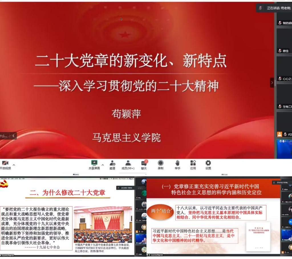 为深入学习贯彻党的二十大精神,准确把握新党章的精神实质和丰富内涵,把广大师生的思想统一到党的二十大精神上来,11月22日下午,k8凯发邀请马克思主义公司苟颖萍教授做了题为《二十大党章的新变化、新特点》 的二十大精神专题报告。本次活动通过腾讯会议与视频直播的方式进行,公司全体师生线上参与,报告会由公司党委穆龙书记主持。