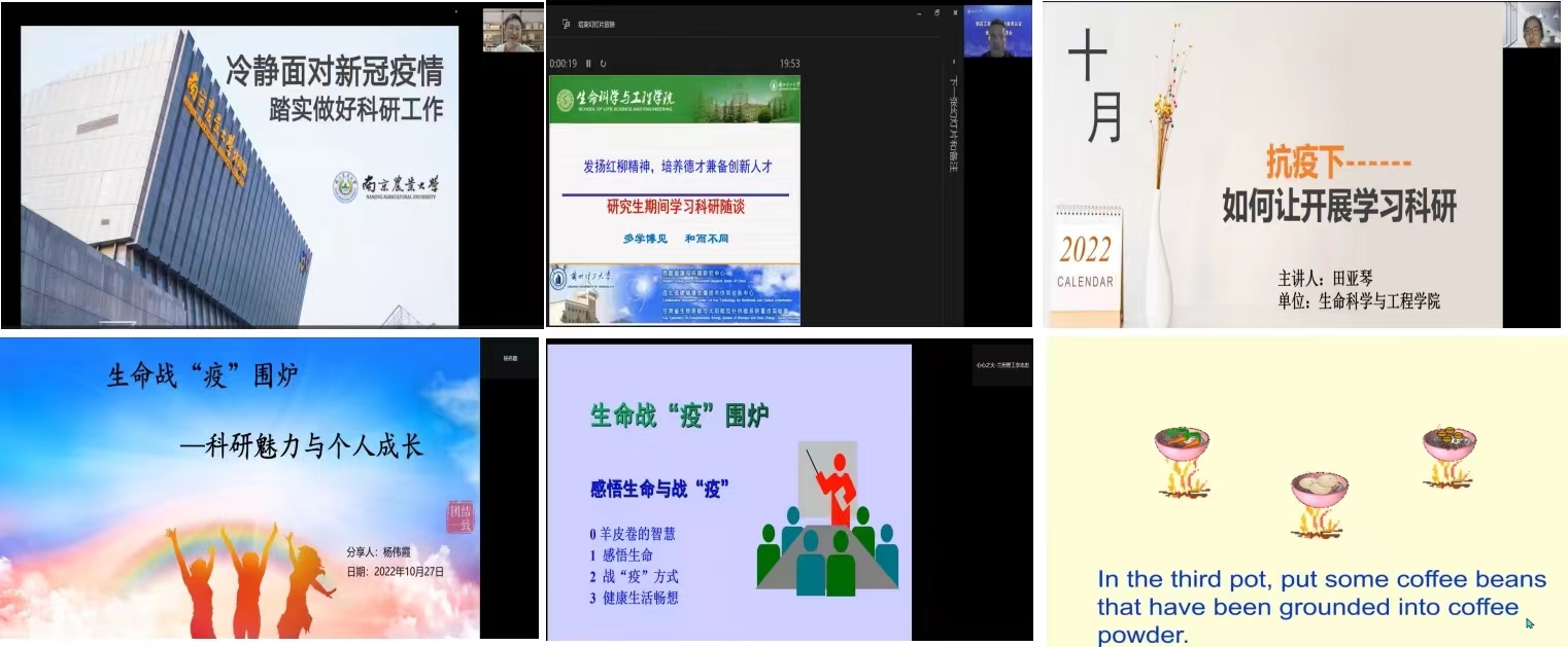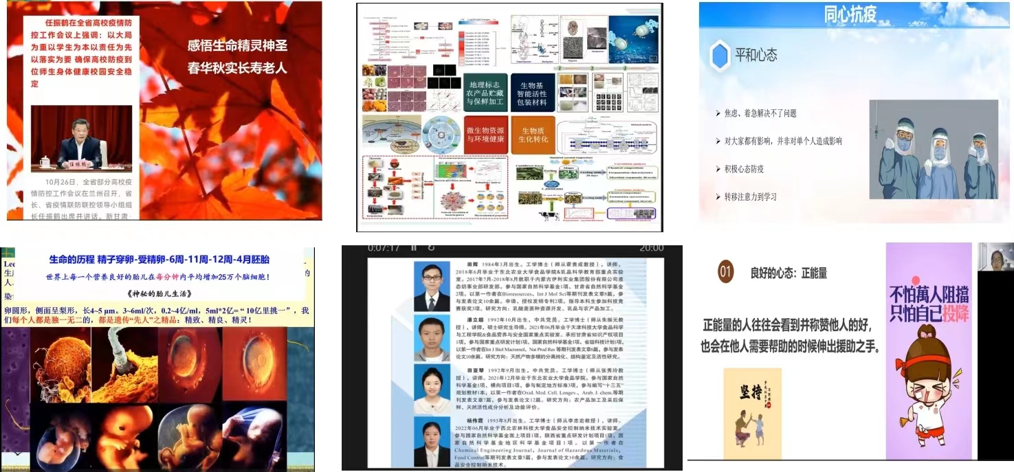 秋季学期开学以来,新冠疫情打破了正常的上课和学习秩序,云端授课的形式给同学们带来了或多或少的焦虑感。为引导疫情期间员工愉快地开展学习、科研工作并健康成长,10月27日晚,生命战“疫”围炉开讲。腾讯会议特邀南京农业大学2019级博士研究生陈鑫(公司2013级食品科学与工程专业员工)、公司近两年引进的田亚琴和杨伟霞两位博士分享了科研魅力与个人成长体验;李志忠教授做了《感悟生命与战“疫”》的讲座。k8凯发公司副经理、生物资源开发与环境健康创新研究团队负责人任海伟教授主持讲座。团队导师制本科生、研究生及部分教师67人在线参会。