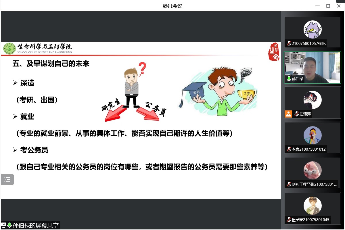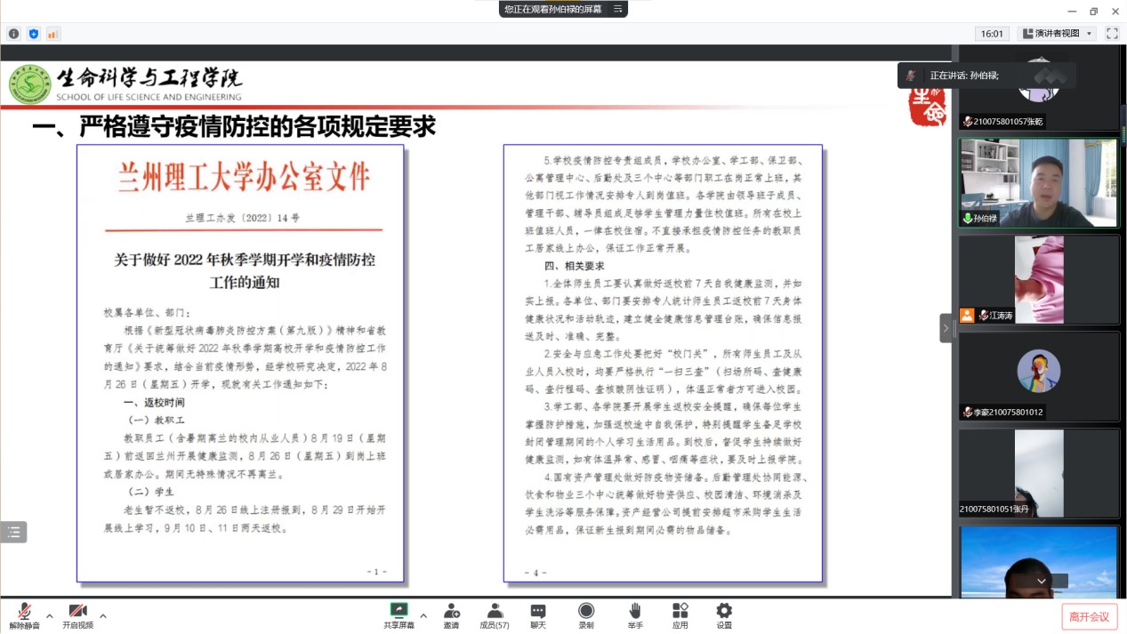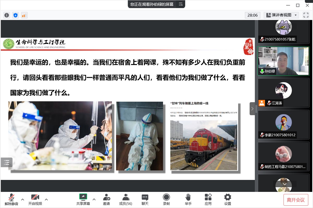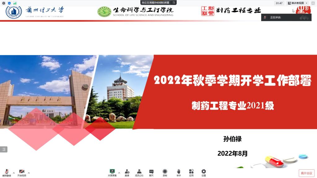 受疫情影响,兰州市大部分高校都采取推迟返校,k8凯发旗舰厅将于8月29日开展线上教学,为了缓解k8凯发21级制药一班学子们疫情在家期间的心理压力,同时为了增强同学们战胜疫情的坚定信念,并引导同学们疫情在家自主学习的兴趣,21级制药工程一班于8月28日15:00召开线上主题班会。本次会议由班主任孙伯禄老师主持,21级制药工程一班全体员工参与。