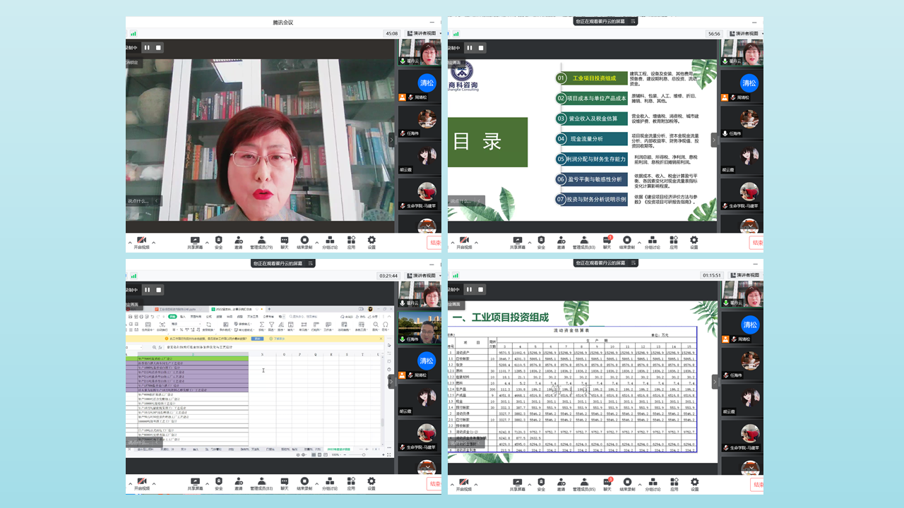 辅导讲座伊始,翟丹云老师结合自己在工作期间主持和参与项目设计的工作经历为同学们普及了有关项目投资和财务评价的专业知识。随后,翟丹云老师从一般工业项目的投资组成、设备投资估算表、固定资产投资估算表、流动资金投资估算表、原材料计算表、定员及费用计算表、折旧计算表、摊销计算表、单位产品成本计算表、现金流量计算表、资本金现金流量计算、财务计划现金流量计算、银行借款还本付息计算、资产负责表、盈亏分析计算、敏感性分析计算等十个方面为同学们进行了详细讲解。同时,结合实际案例重点从设备、项目费用、工程概算、生产投入、车间、投资等方面进行了辅导。辅导讲座结束后,翟丹云老师和参会师生进行了互动交流,对老师和同学们提出的问题做了详实的回答。