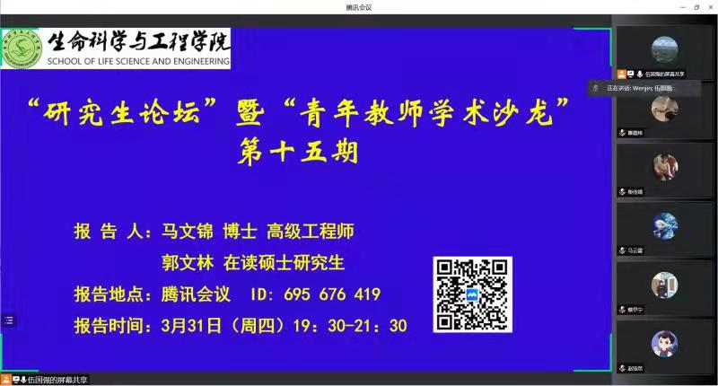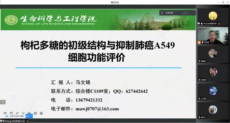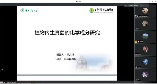 马博士围绕“枸杞多糖(Lycium Barbarum Polysaccharide)的提取方式、初级结构解析与抑制肺癌A549细胞功能分析”三个方面内容进行了阐述,通过详尽的图表和实例让同学们对枸杞多糖在抑制肿瘤活性研究方向有了新的认识和了解。随后郭文林同学介绍了植物内生菌的定义、多样性及生物学功能,并举例说明了植物内生菌的活性应用,同时分享了植物内生菌提取、鉴定等相关研究成果。互动环节,老师和同学们结合自己的研究方向提出了一些问题和建议,并与主讲人深入探讨课题相关的研究情况,使在场同学受益匪浅。伍国强对本次学术交流会进行了总结,他指出当前疫情防控的形势依然严峻,同学们要合理利用和规划好线上听课与线下学习时间。