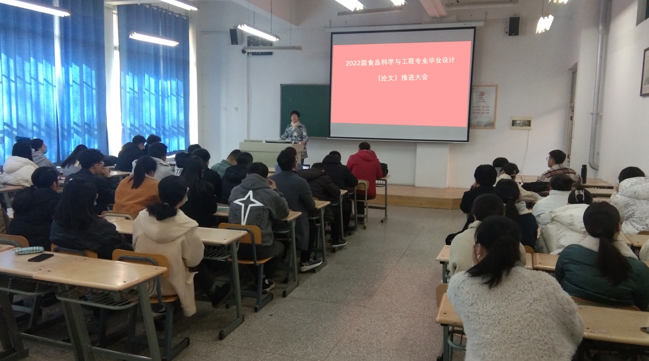 为了有效推进食品科学与工程专业毕业设计(论文)的顺利进行,确保毕业设计(论文)相关事宜的如期实施。3月1日下午,在西校区1-103教室举办了2022届食品科学与工程专业毕业设计(论文)推进大会。全体设计指导老师和全体同学参加了此次大会,大会由系主任王雅老师主持。