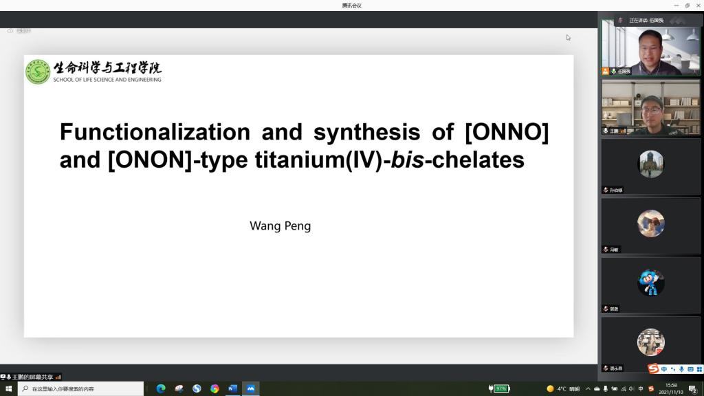 随后,2020级硕士研究生王鹏结合目前开展的工作,做了题为“[ONNO]型钛配合物的合成及后修饰研究”的报告,介绍了金属药物在抗癌药物研究领域的独特优势,分别就自己开展的“钯催化Sonogashira反应对具抗癌活性的[ONNO]型“Salan”、“2,6-吡啶二甲酸”双配位钛化合物进行高效后修饰研究”、“Sonogashira反应直接向两个配体引入不同炔烃功能基团”等工作做了详细的介绍,该工作为金属抗癌药物安全性和毒性研究以及方法学潜在的应用价值做了前瞻性探索。