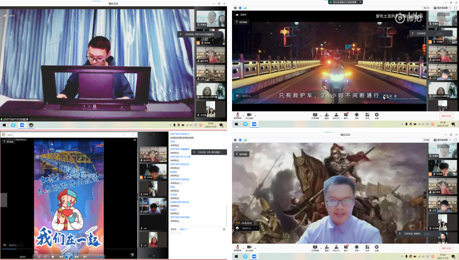 接下来,20级生物工程一班刘忍静与石正明同学作为主持人,宣布班会的正式开始。首先石正明同学给大家播放了抗疫小视频,希望同学们要对抗疫充满信心与希望。随后,同学们的精彩表演便依次开始。优美的钢琴独奏萦绕耳畔,合唱《晴天》、《遇见》、《平凡之路》扣人心弦,激情慷慨的《老将行》、《再别康桥》朗诵奔涌于岁月长河,游戏《谁是卧底》也班会增添了互动和色彩。最后,王昕为大家播放了18级生物工程一班制作的“加油!甘肃!”的抗疫小短片,呼吁同学们出门戴口罩、行动听指挥,到此,本次班会落下了帷幕。节目结束后,武书记和唐老师对本次班会进行了简要总结和评价,称赞大家的表演内容十分精彩,同学们的精神面貌值得称赞,相信同学们能够像梅花一般,在冷若冰霜的疫情结束后,终将迎来山花烂漫的温暖的春天。