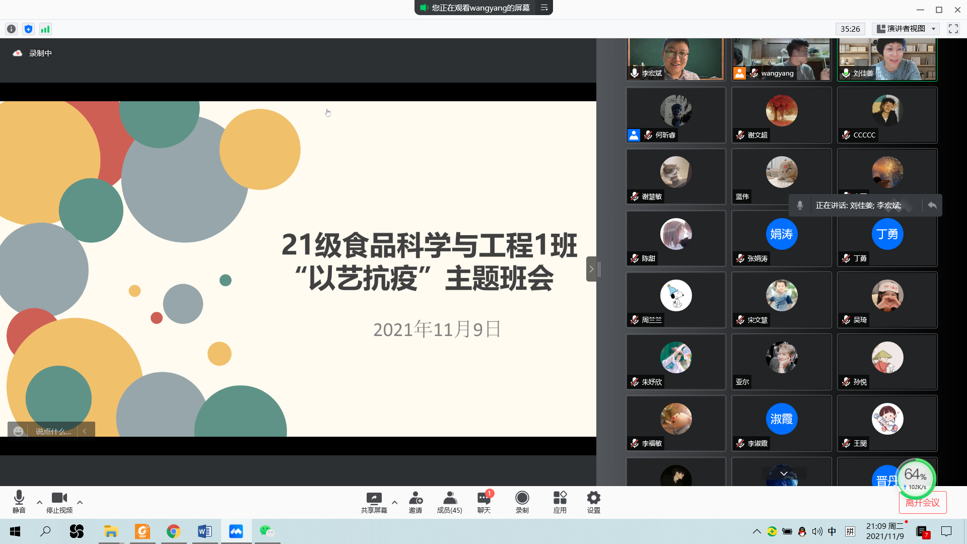 落叶满地,遍地黄金,本是绚丽的季节却因为突发的疫情被蒙上阴影。由于兰州疫情突发,公司及时调整了授课计划,部署了特殊时期教学工作。在保证疫情防控的同时,为了适当疏解同学们的心理压力,让同学们的课余文化生活有声有色,11月9日,21级食品1班以线上的方式组织召开了 “以艺抗疫”为主题的班会。本次班会还有幸邀请到公司纪委副书记刘佳姜,k8凯发副经理任海伟及食品系主任王雅老师参加。