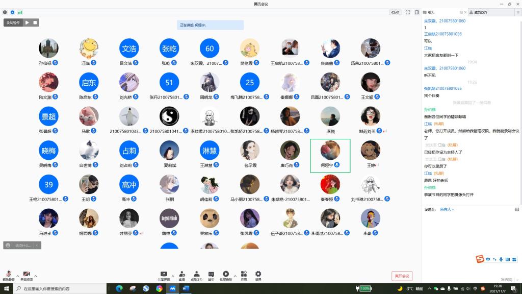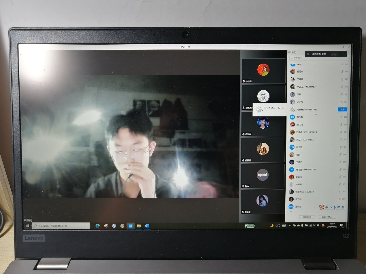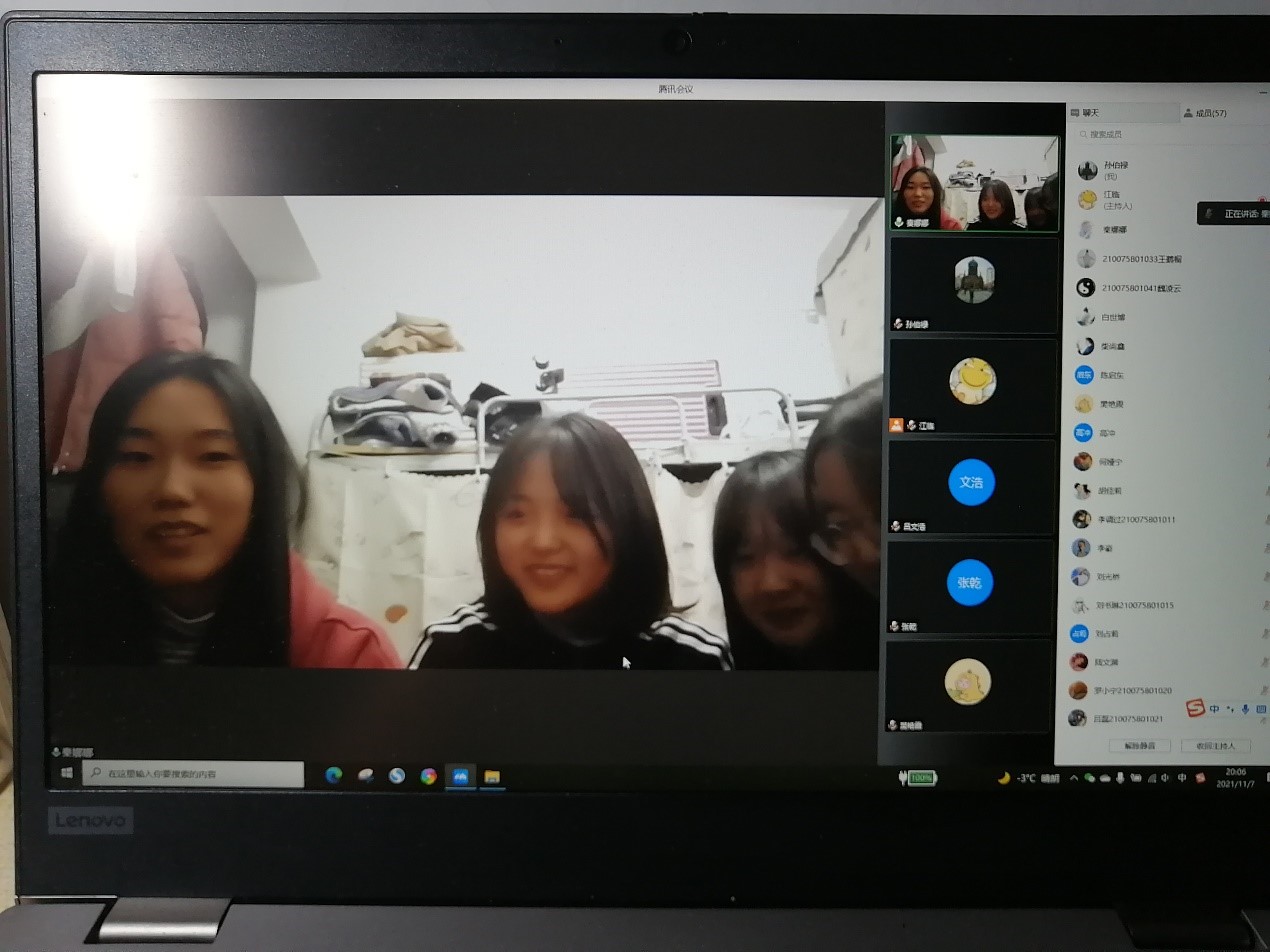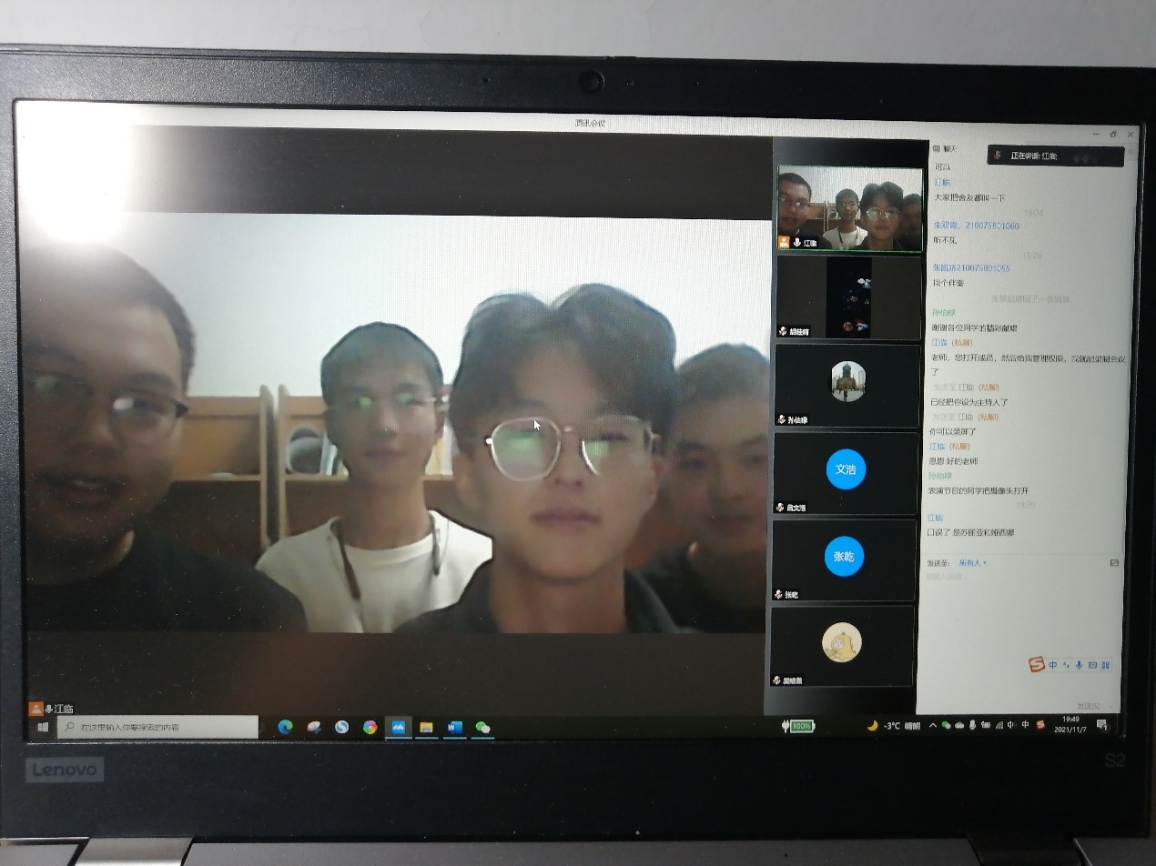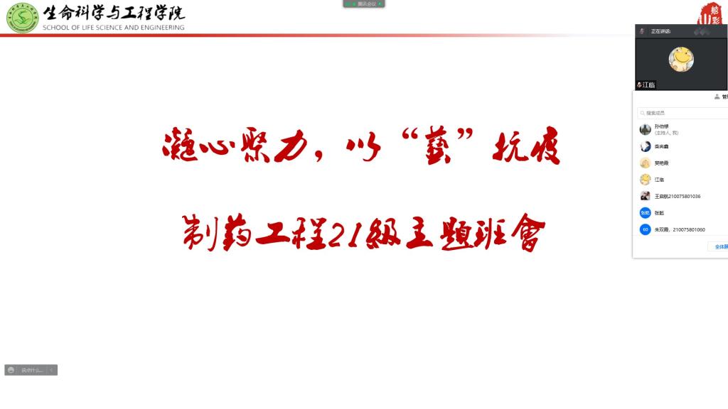 为了让同学们可以用积极的心态去对待疫情,采取更好的心态去上网课,增进同学们的友情,丰富在校老员工封校期间的校园生活,21级制药一班于11月7日19:00在线上开展了“凝心聚力,以‘艺’抗疫”主题班会,班会由班长江涛涛同学和胡佳莉同学主持,班主任孙伯禄老师及21级制药工程一班的全体同学们参加了本次班会。
