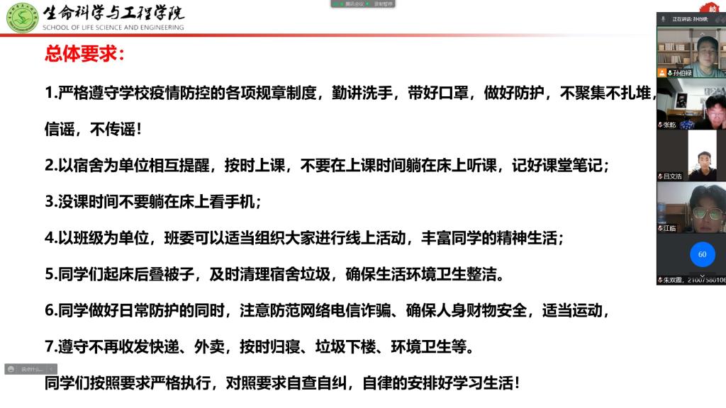 这次会议让同学们在欢乐的同时,又有了新的思考。如何在疫情当下封校停课期间,丰富校园生活的同时保持自律、自觉,主动学习以是重中之重。在班主任老师的悉心教导和关怀下,在班委和同学们的共同努力下,21级制药工程一班的同学们保持乐观的态度,积极向上,努力学习自己的专业知识。在疫情并未结束之时,在今后的校园的生活中,班主任老师再次强调,同学们要继续加强自我管理,遵守公司有关抗击疫情的规章制度,为抗疫的早日胜利贡献自己的微薄力量。