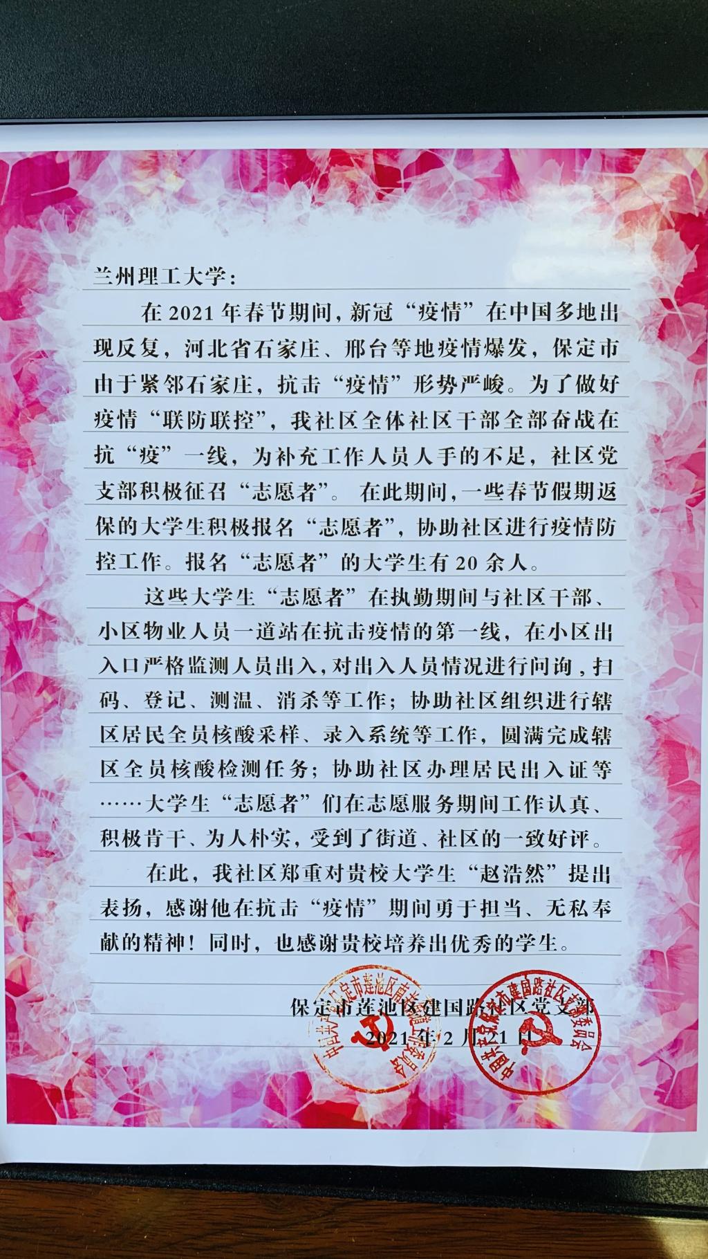 表扬信中称,2021年1月,河北省石家庄市新冠肺炎疫情出现反复,毗邻石家庄的保定市抗疫形势十分严峻。赵浩然同学寒假返乡后主动到社区报备自己的行程,核酸检测呈阴性之后,作为一名入党积极分子,毫不犹豫的报名参加了社区的防疫志愿者工作。