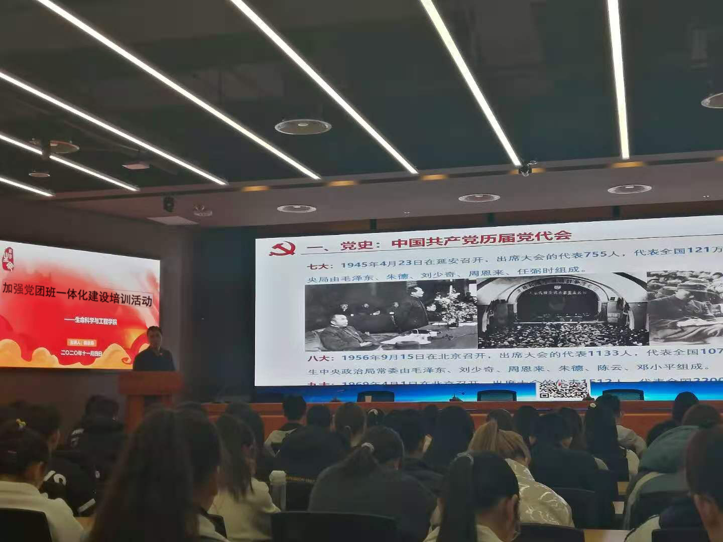 培训由陈永泰主讲,陈书记以中国共产党历届党代会为主线,对中国共产党发展史做了详细讲解,让同学们清楚认识到中国共产党发展壮大的艰辛,中国共产党带领全国人民实现共同富裕的不易,要求同学们要学会从党的历史演进中获取经验智慧、认识发展规律、把握前进方向;接着进行团史讲解,把团史同做好新时代共青团工作结合起来,聚焦老员工团学工作的主责主业,要求要全面从严治团,团学工作者要在思想上更加坚定跟党走、听党话。最后,陈书记祝愿所有同学走好自己的“长征路”,好好学习,全面成才,只争朝夕,不负韶华,为实现中华民族伟大复兴的中国梦而努力奋斗。
