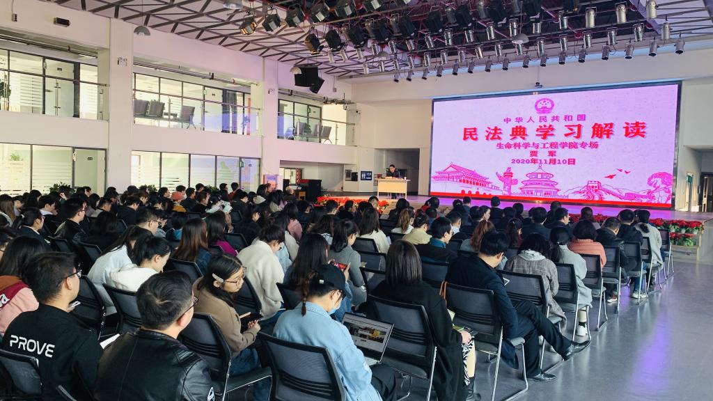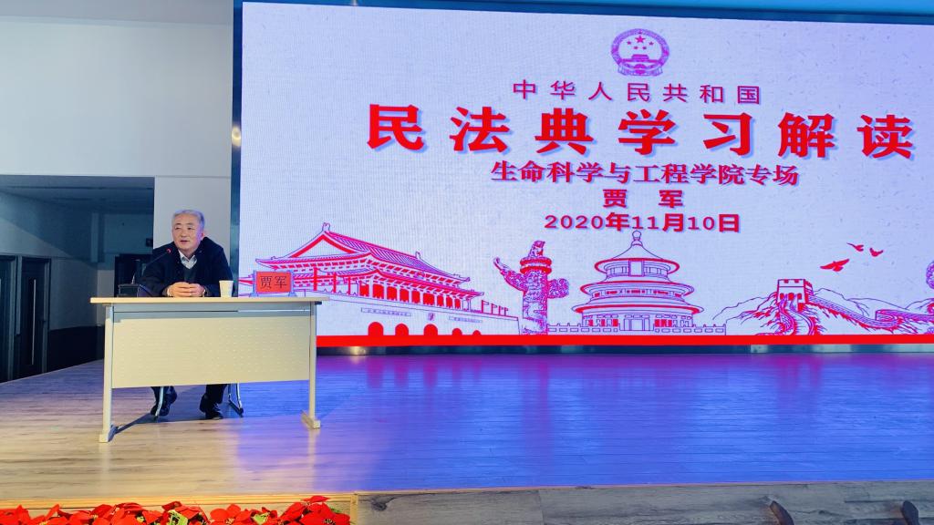 贾军教授从《民法典》的编纂历程、重要意义、体系架构、主要内容及变化亮点等方面进行了全面解读,详细讲解了《民法典》的总则、物权、合同、人格权、婚姻家庭、继承、侵权责任及附则共 7 编 1260 条,涵盖了公民从出生到终老各个阶段的各种法律问题。贾教授的讲解内容丰富、举案说法、深入浅出,对我们如何理解和把握《民法典》,怎样在工作实践中抓好《民法典》的贯彻实施,增强师生法治意识,弘扬法治精神,提高运用《民法典》维护师生合法权益、化解矛盾纠纷的意识和能力,具有很好的指导意义。贾教授的精彩讲座获得了与会师生的热烈掌声和衷心的谢意,受到大家的一致好评。