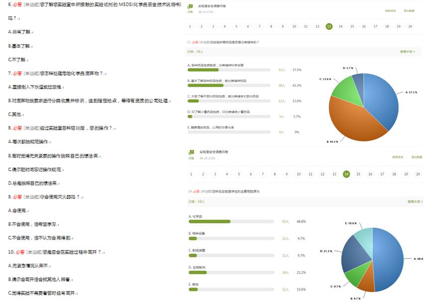 实验室安全问卷调查和实验室安全知识竞赛是公司“实验室安全文化月”活动的重要组成部分。实验室安全问卷调查活动利用超星SPOC平台,在线上开展,问卷涵盖了实验室安全管理、消防应急设施、危险化学品废弃物处置、突发事故应对等方面,毕业生参与此次问卷调查,为实验室日后的安全工作提供了参考。