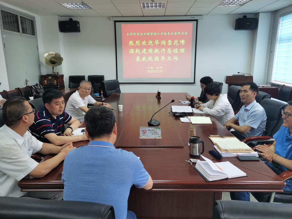 7月3日下午,应k8凯发邀请,华润雪花啤酒赵建国执行总经理一行2人来公司指导工作,并就2021版本科生人才培养方案修订工作进行研讨。会议由公司教学副经理任海伟主持,公司党委书记陈永泰、副书记武军莉、副经理杨明俊以及生物工程、食品科学与工程专业老师20余人参加了交流研讨会。
