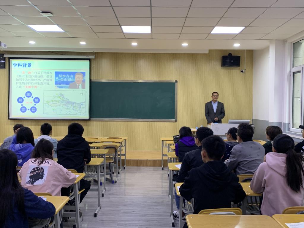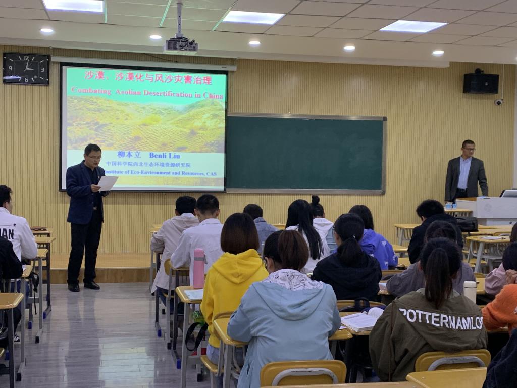柳本立博士作了题为《沙漠、沙漠化与风沙灾害防治》的报告,主要介绍了敦煌莫高窟风沙危害综合防治方法及工程设计、敦煌鸣沙山风沙危害成因及流场恢复治理工作。柳博士的报告图文并茂,引起了师生极大兴趣。