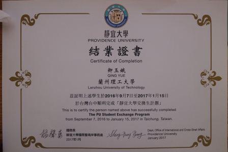 在公司和台湾静宜大学签署合作协议之际,卿玉娥积极报名,于2016年秋季学期在台湾静宜大学交换学习一学期。交换学习过程中,主动修习研究生课程,联系老师做实验,提升了自己专业能力和科研能力。从台湾交流学习返校后利用假期时间在甘肃省商业科技研究所、北京捷利亚种业有限公司实习,提升自己的实践能力。