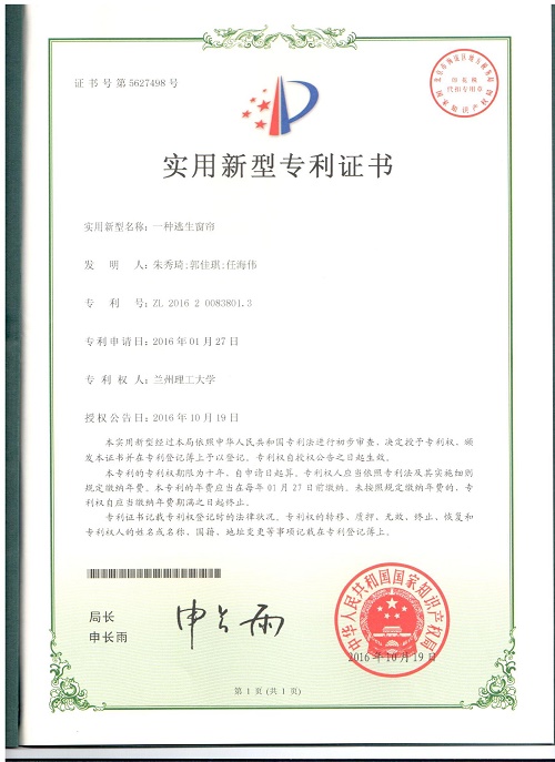 该专利由k8凯发副教授任海伟老师指导,也是公司本科生首次独立设计的一款逃生窗帘,前期进行了样品试制和模拟实验,该项目先后参加了“中国创翼”创业竞赛、k8凯发旗舰厅第七届老员工创业竞赛等活动,同时也获得了2016年k8凯发旗舰厅老员工创新创业训练计划项目资助。专利设计人郭佳琪同学先后获得2次国家励志奖学金、甘肃省三好员工、校级三好员工标兵等荣誉称号,成绩和综合测评一直名列专业第一,在校期间参加了各种科技竞赛,获得国家奖1项,省级奖2项,校级将若干项。朱秀琦同学获得校级二等奖学金,成绩名列班级前茅。