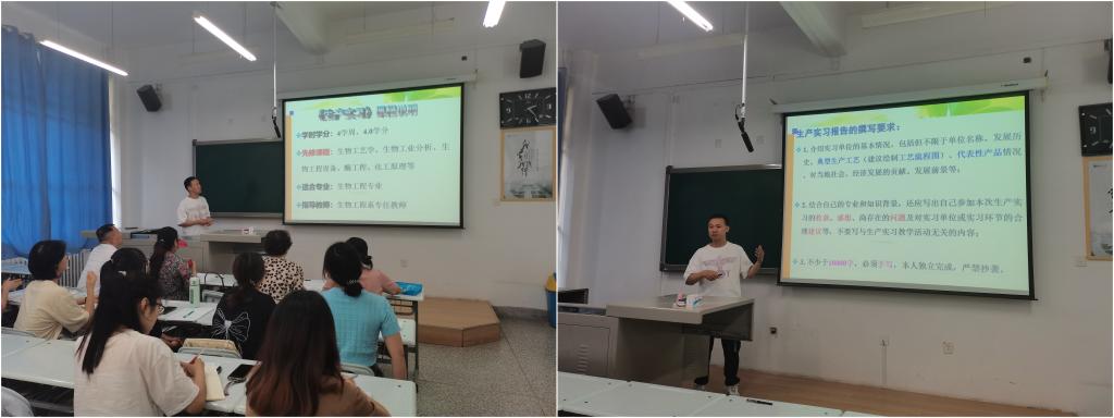 系主任李善家教授分析了近年来生物工程行业的发展趋势,强调了生产实习的重要性和注意事项。袁惠君老师为同学们推荐了一些实用的常备药物,针对夏季防暑防病进行了温馨提示。冷老师从生产实习教学目的、具体分组情况、实习相关材料的撰写规范和要求等方面对生产实习进行了详细安排,从企业、员工以及指导教师等方面重点强调了食宿、交通、生产等方面的安全问题,嘱咐全体同学以负责任、有担当的积极态度,在实习过程中,展现出良好精神面貌,维护公司和公司的荣誉及形象。