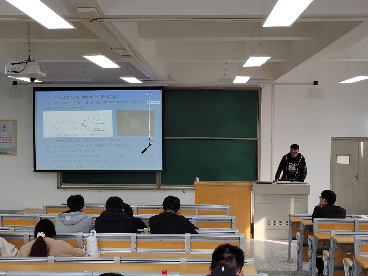 随后,孙伯禄老师介绍了第二位报告人陈建国的个人情况。陈建国同学就自己的科研成果进行了报告,运用各种色谱分离方法,从粉防己根中分离出一个新的化合物:粉防己碱E,其具有作为抗肿瘤药物开发的潜在价值。同时也介绍了自己目前的研究方向和内容:天然磷酸二酯酶的筛选和分离,研究设计合成出系列双取代的磷酸酯,筛选出TLC生物自显影的新型底物。报告结束后,参会师生与报告人就科研中遇到的问题和未来的研究方向进行了讨论交流。