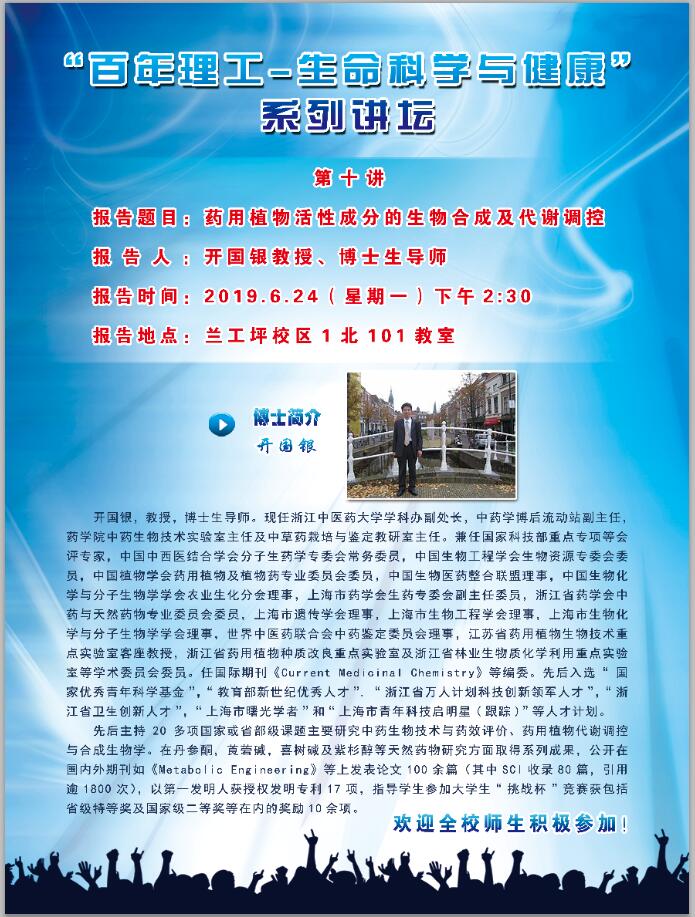 应k8凯发邀请,浙江中医药大学学科办副处长,中药学博后流动站副主任,药公司开国银教授将于2019年6月24日来k8凯发旗舰厅作学术报告, 欢迎全校师生积极参加!
