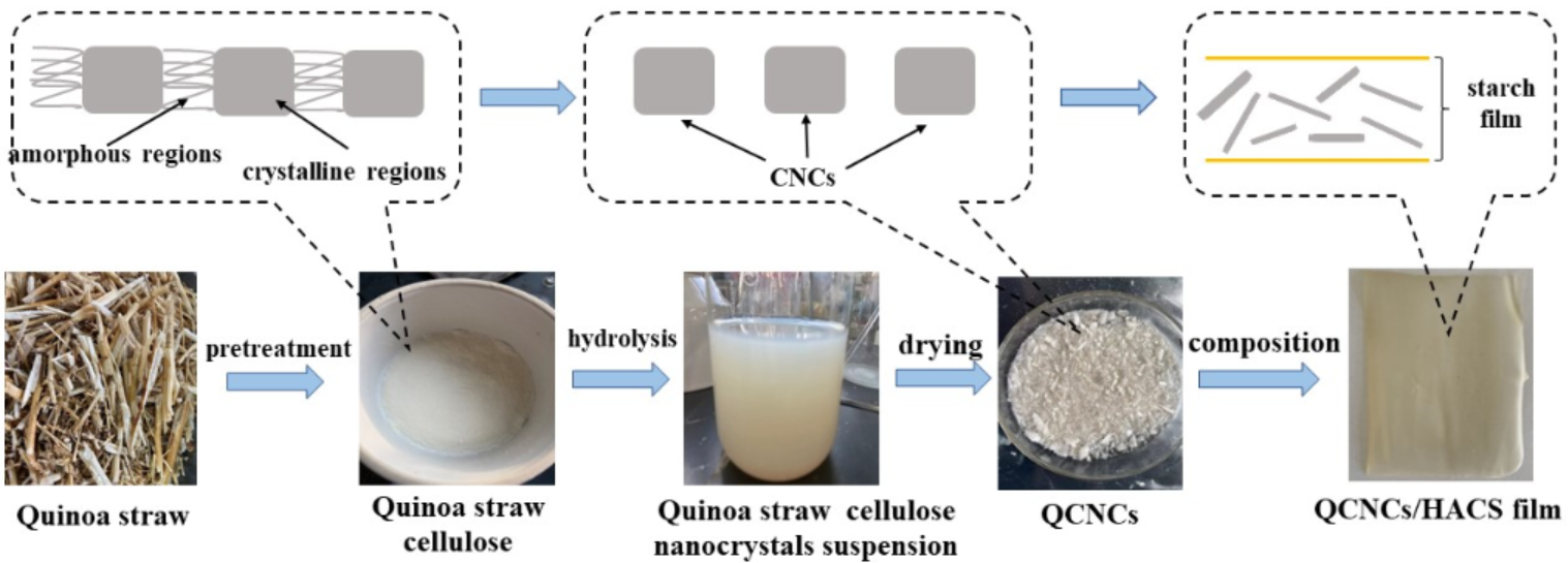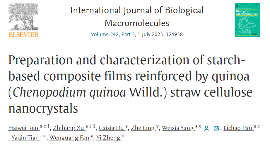 近日,k8凯发生物资源开发与环境健康创新研究团队在中科院一区化学类TOP期刊《International Journal of Biological Macromolecules》(IF = 8.025)发表了题为 “Preparation and characterization of starch-based composite films reinforced by quinoa (Chenopodium quinoa Willd.) straw cellulose nanocrystals”的研究论文(DOI: 10.1016/j.ijbiomac.2023.124938)。该论文以k8凯发旗舰厅为第一单位和通讯单位,任海伟教授为第一作者,2020级硕士研究生徐志航为共同第一作者,杨伟霞博士为通讯作者。