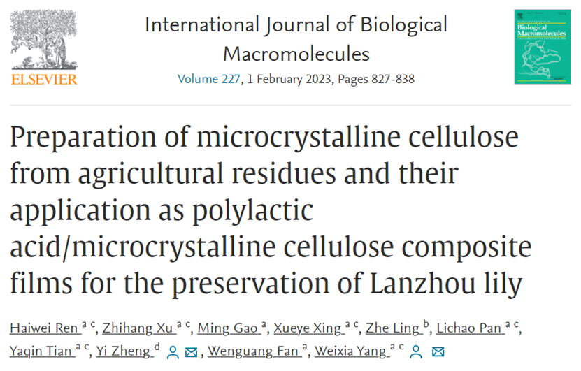 早前,团队2020级硕士研究生徐志航还在该期刊发表了题为“Preparation of microcrystalline cellulose from agricultural residues and their application as polylactic acid/microcrystalline cellulose composite films for the preservation of Lanzhou lily”的研究成果,该研究从甜高粱、白酒糟、中药渣和菊芋秸秆中制得微晶纤维素(MCC),再将MCC与聚乳酸(PLA)复合制得MCC/PLA膜材料。该工作系统地研究了不同添加量的MCC对复合膜物理化学性能的影响效果;并详细地研究了MCC/PLA膜材料对兰州百合的保鲜效果。该研究成果为农业废弃物在食品保鲜中的应用提供了一定的理论基础和技术依据。