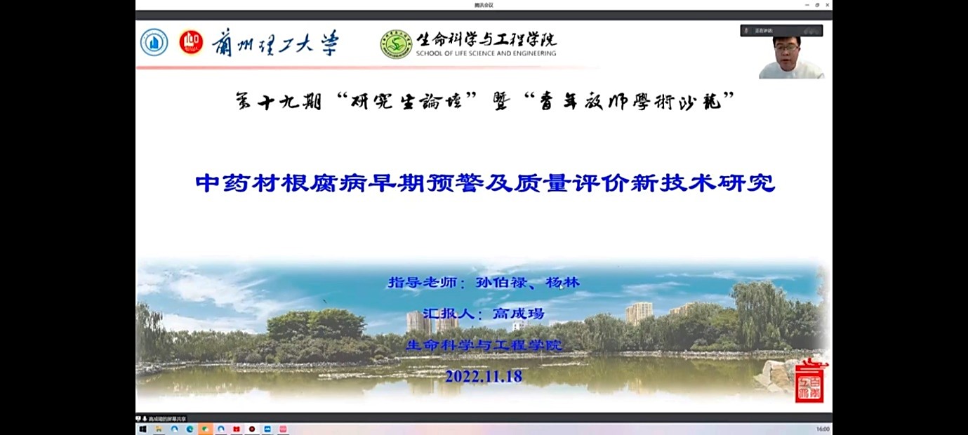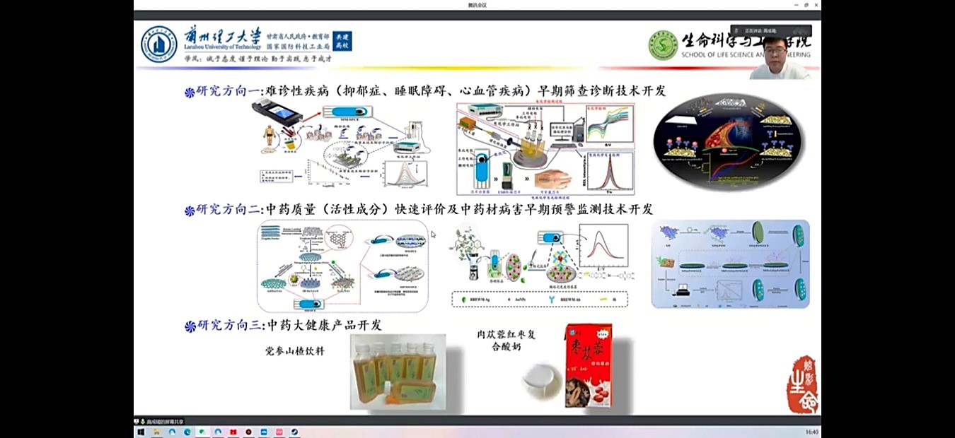 2020级药学专业硕士研究生高成瑒结合目前开展的工作,做了题为“中药材根腐病早期预警及质量评价新技术研究”的报告,主要介绍了电化学传感器技术在中药材病害标志物及基于指标性成分的中药材质量评价中的独特优势,分别就自己开展的“基于柔性电极的中药材根腐病早期预警电化学免疫传感器研究”、“用于板蓝根质量评价电化学传感器的研究”等工作做了详细的说明。该研究综合药学、电化学、材料学等知识,为中药材病害的早期预警、中药材质量即时评价和质量溯源进行了前瞻性的探索。冷非凡副教授结合自己工作实际,对后续延展性、创新性工作提出了一些建设性的意见。