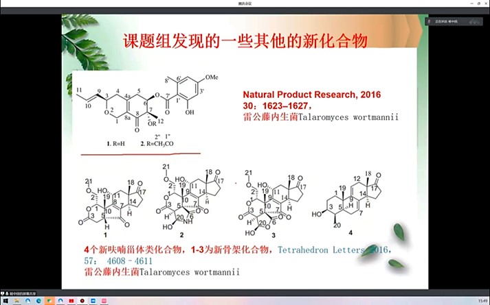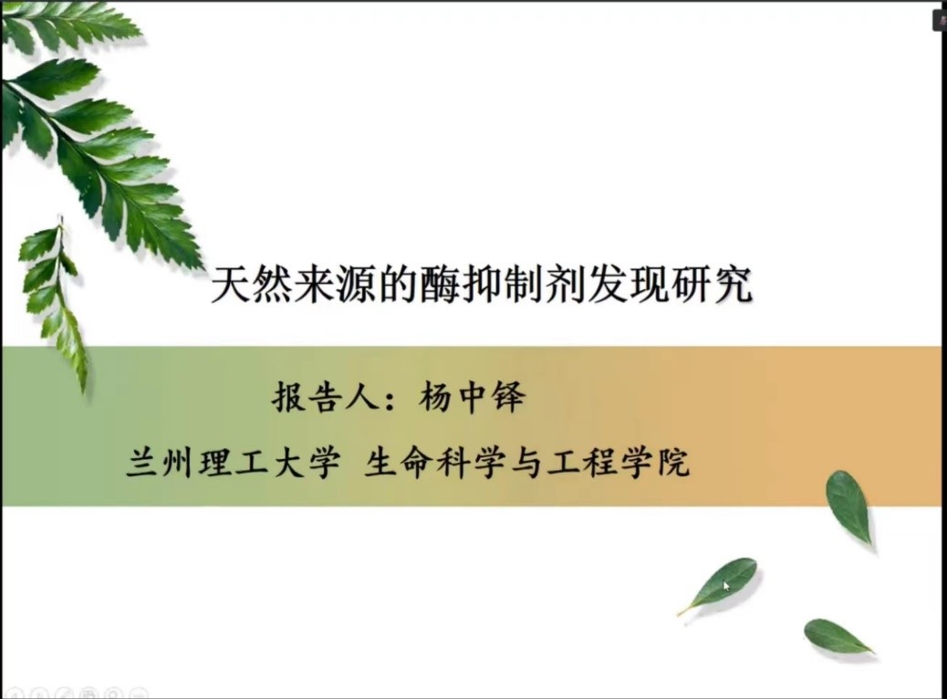 冷老师首先介绍了参加本次线上研究生论坛的杨中铎教授和硕士研究生高成瑒的基本情况及学术成果。杨中铎教授结合课题组开展的研究工作,做了题为“天然来源的酶抑制剂发现研究”的报告,以阿尔茨海默症(AD)为切入口,报告了课题组主要关注的乙酰胆碱酯酶抑制剂、单胺氧化酶抑制剂和磷酸二酯酶抑制剂的构效关系及临床用途,并以此为发现新药的靶点,对目前实验室开发的以PDE的TLC生物自显法筛选技术为支撑的藏药毒毛妞中的乙酰胆碱酯酶抑制剂进行了结构改造,进行了活性分析,通过“跳台实验”和“水迷宫实验”验证其活性。深入浅出的介绍了从荷叶、百部、路路通等中药材以及两面针、钩藤、雷公藤等内生菌中分离出的一系列酶抑制剂。