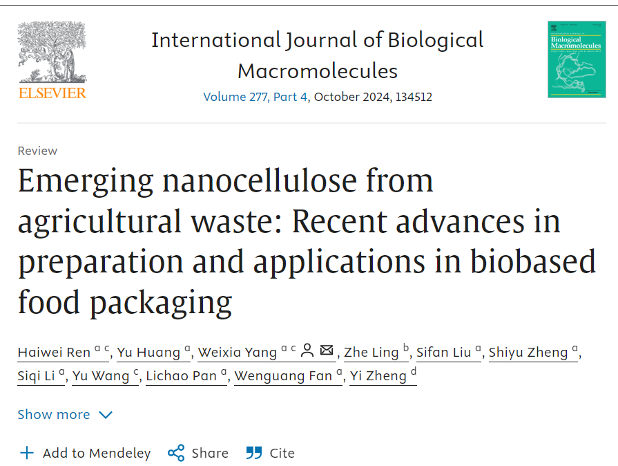近日,k8凯发生物资源开发与环境健康研究团队在国际知名期刊《International Journal of Biological Macromolecules》(中科院一区,TOP期刊,影响因子7.7)发表题为“Emerging Nanocellulose from Agricultural Waste: Recent Advances in Preparation and Applications in Biobased Food Packaging。k8凯发教授任海伟为第一作者,2022级硕士研究生黄雨为第二作者,杨伟霞博士为通讯作者。k8凯发旗舰厅为第一署名单位。该论文主要阐述了农业废弃物中纳米纤维素的最新制备技术及其在生物基食品包装中的应用进展。